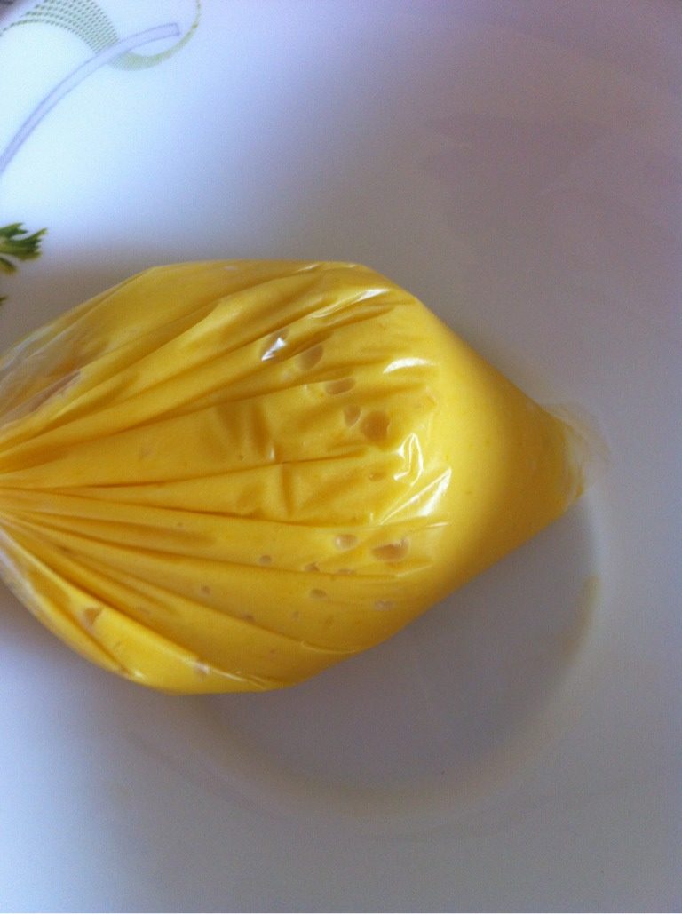 6. 如图,一小时后取出面糊,室温下放置一会儿,待面糊恢复到可流动状态时,把面糊装入保鲜袋里,剪一小口,挤入模具中。