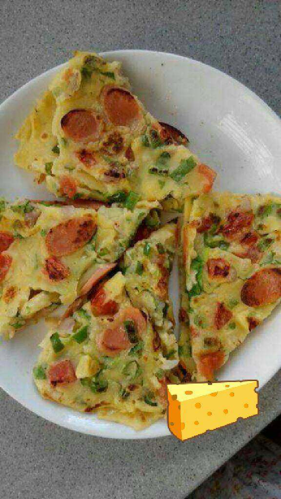 7. 倒入搅拌好的面糊,摊成圆形。其实鸡蛋饼是我们家早餐出镜率比较高的了,简单方便又营养呢!