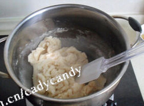 1. 水和色拉油放入锅中煮沸后加入面粉,继续加热,和成面团后,关火