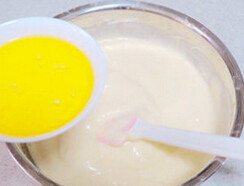 3. 蛋黄糊加入蛋白中,用手动打蛋器拌匀