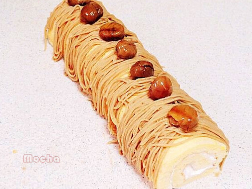 12. 将栗子奶油馅填入挤花袋中,挤在蛋糕卷上。装饰上糖渍栗子,撒上糖粉即可