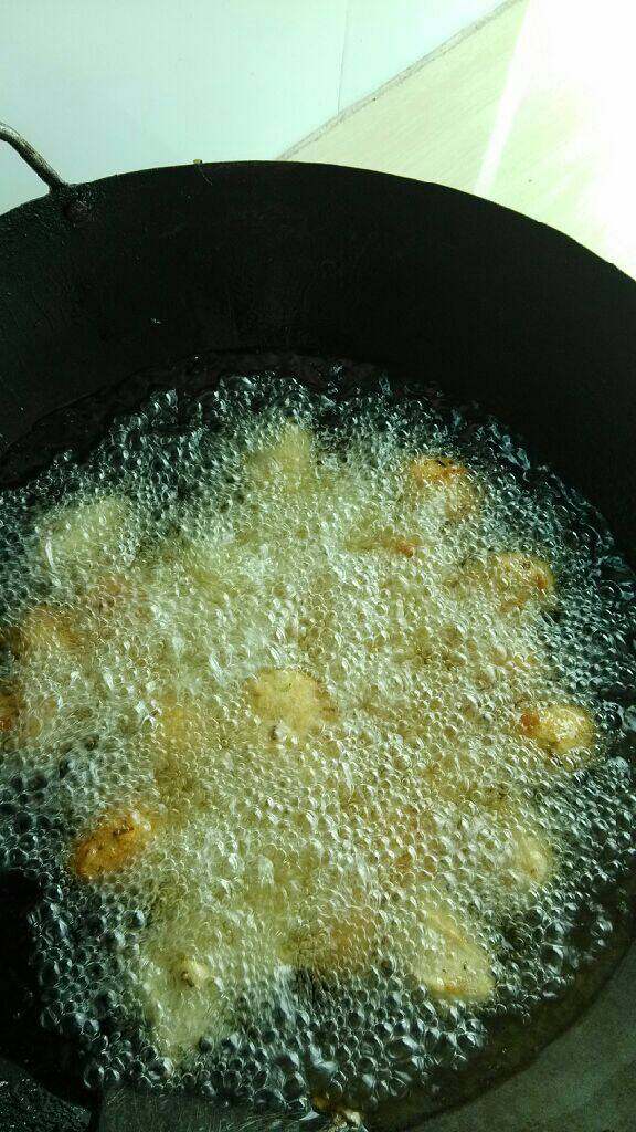 5. 待油温八成热时,左手虎口挤出丸子右手拿勺粘上水后把左手的丸子挖出放入油中炸,以些类推