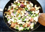 4. 在加入鲜香菇、玉米粒、甜豌豆翻炒数下