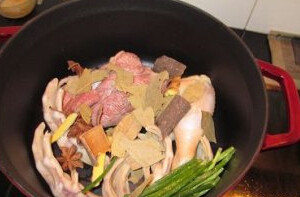 2. 锅内放入牛肉、鸭掌,放上香葱、八角、香叶、桂皮、姜