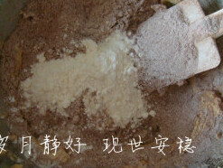 3. 低粉中加入可可粉,拌匀,过筛,筛入奶油糊中,加杏仁粉,用橡皮刮刀拌匀,