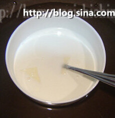 2. 吉利丁在冷水中泡软后,和糖放进淡奶油中,隔热水溶化