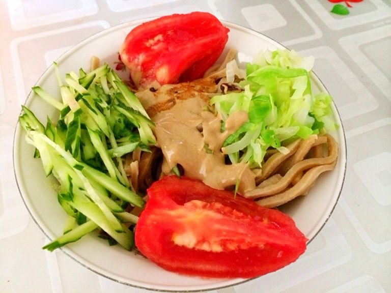 14. 面条盛入碗中,浇上麻酱汁、酱油汁、醋蒜、菜码拌匀食用。太香啦!