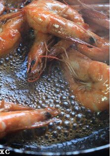 5. 将酱汁倒在虾上,翻炒几下
