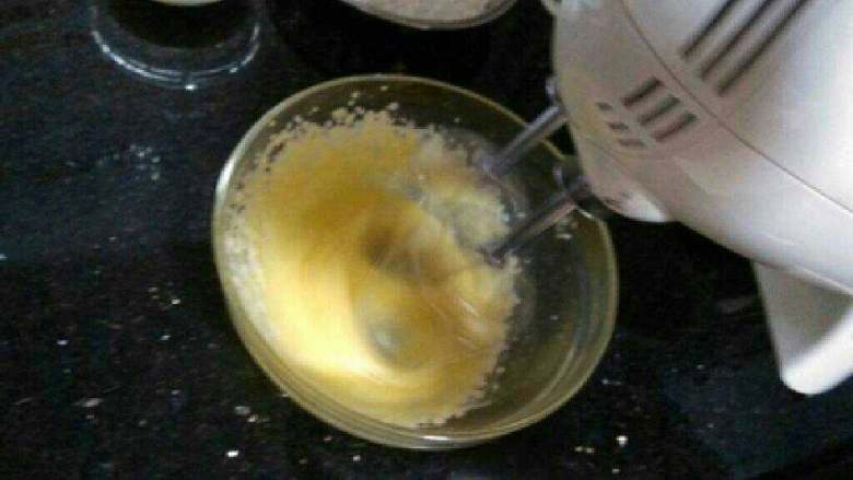 2. 软化后的黄油用电动打蛋器打散,加入细砂糖,手动将糖和黄油搅拌均匀,再打至膨发。