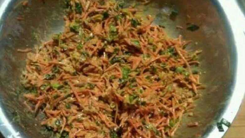 4. 先将葱花放入装胡萝卜容器里。接着加入肉末。