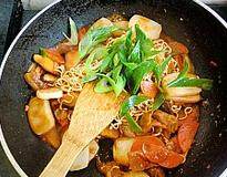 6. 再放入泡菜炒香,加入胡椒粉,年糕炒均