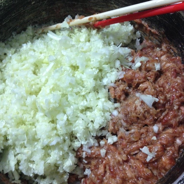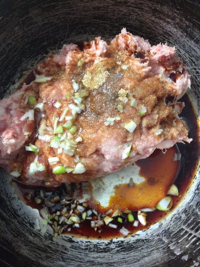 1. 如图肉馅里加入生抽,葱,花椒粉,适量油