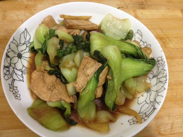 5. 如图,鸡肉变色后,放入油菜,加入蚝油,酱油
