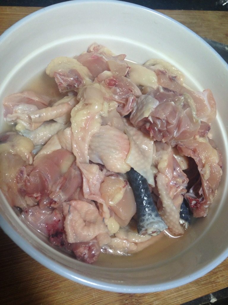 1. 如图鸡洗净放入料酒、生姜拌匀腌10分钟。