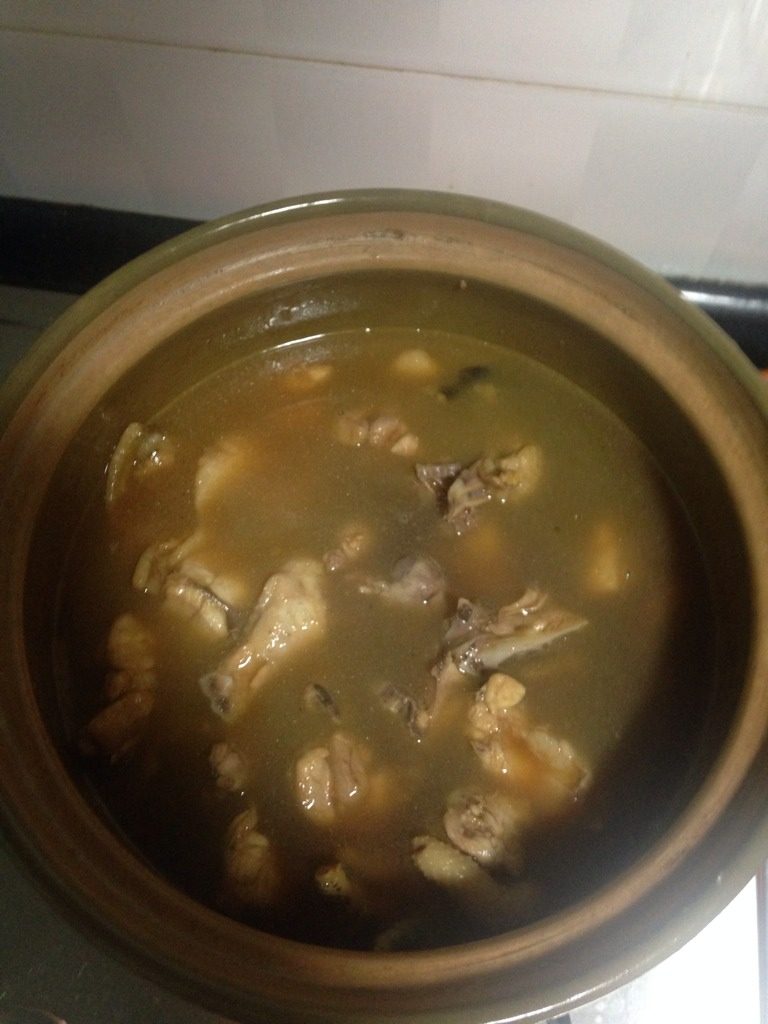 6. 如图加入水没过鸡肉,大火烧滚转小火焖半小时。