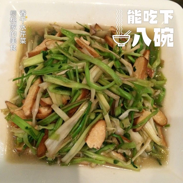 4. 如图倒入水芹菜与香干一起煸炒,加入盐、糖少许,继续煸炒;