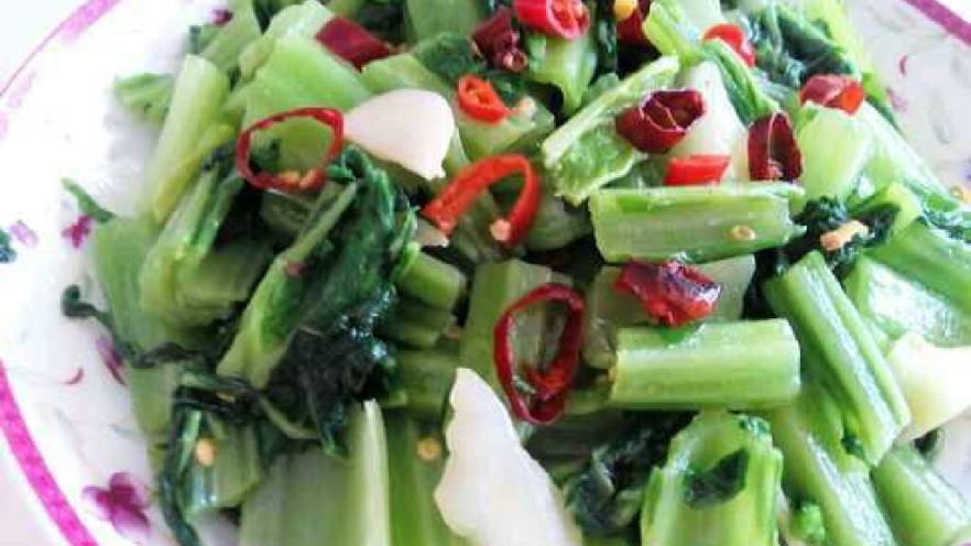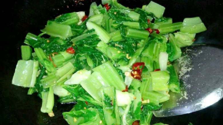 5. 菜梗煮得差不多了就把菜叶倒进去。