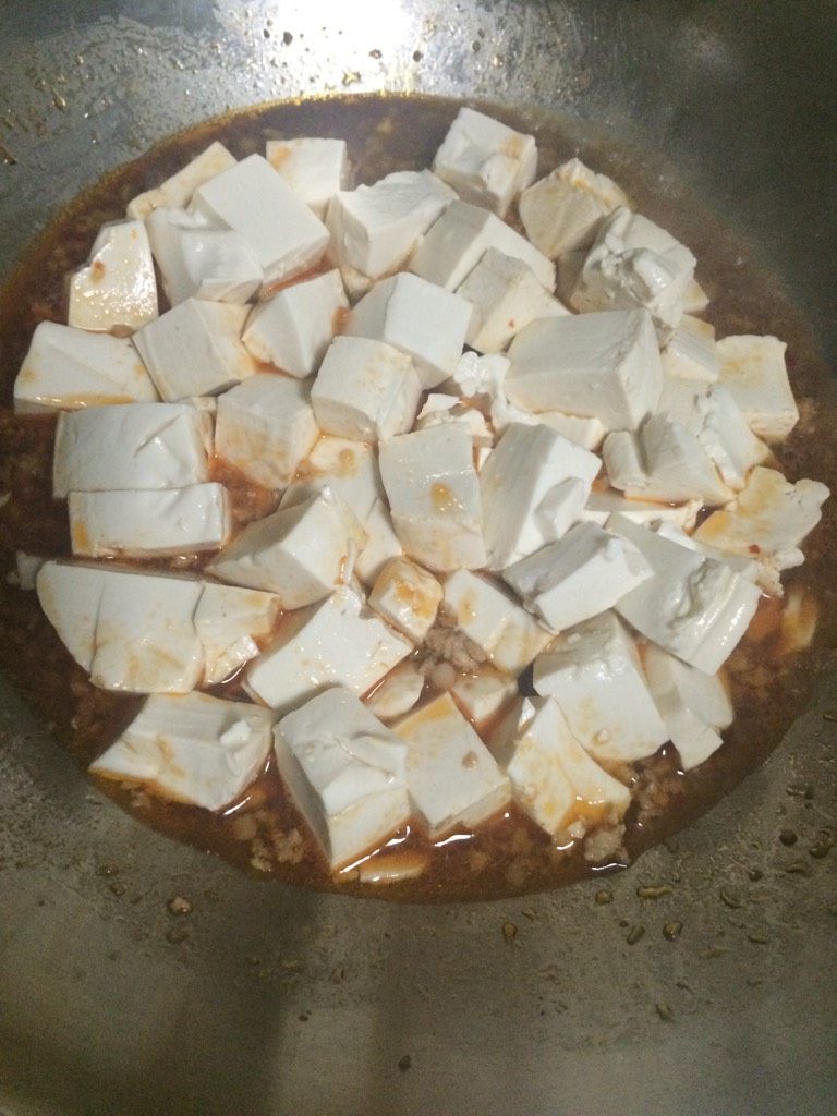 5. 如图水煮沸后倒入豆腐,加盖子煮3-4分钟;