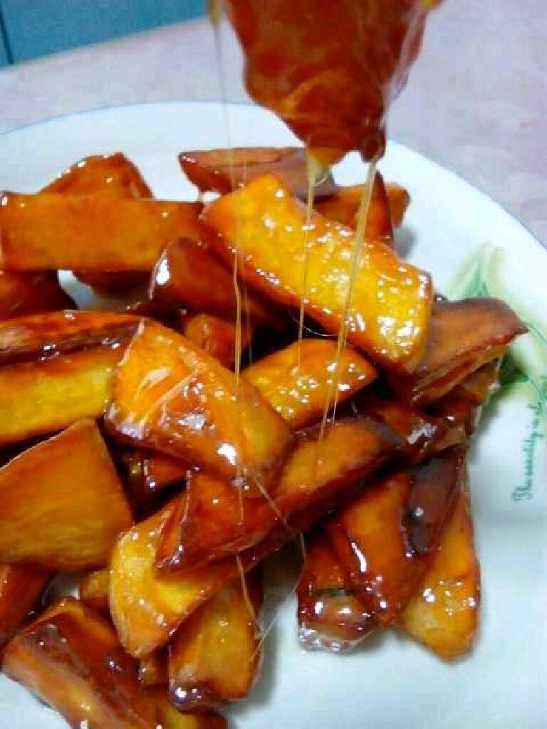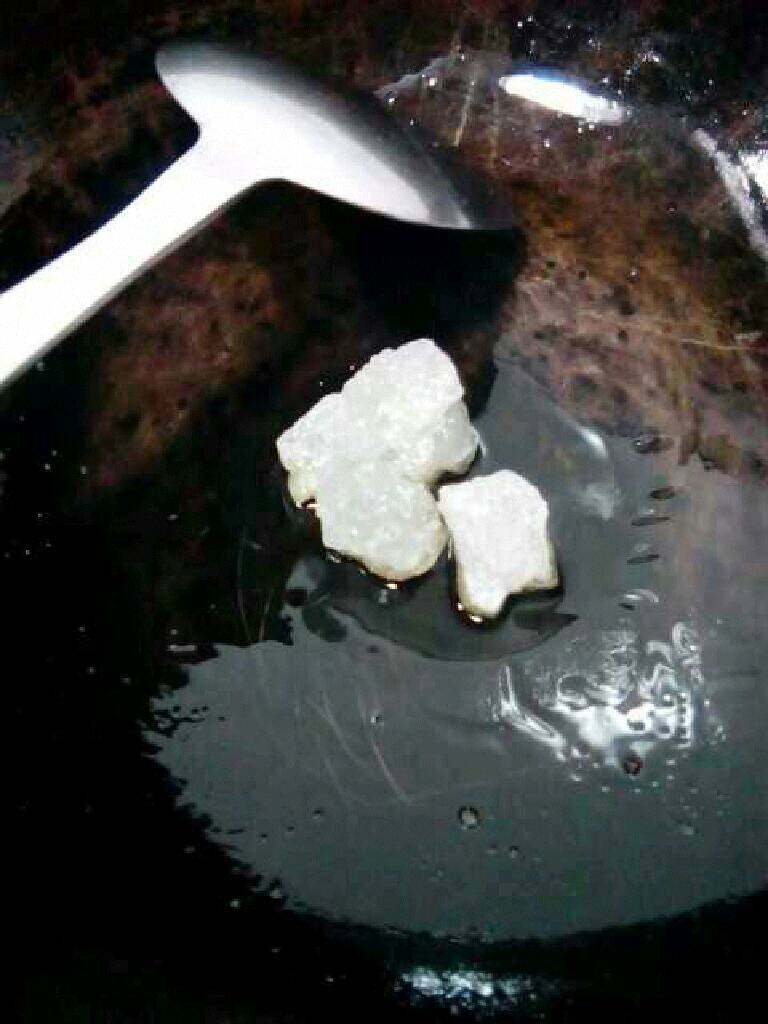 7. 锅里炸番薯剩下的油把冰糖放进去。