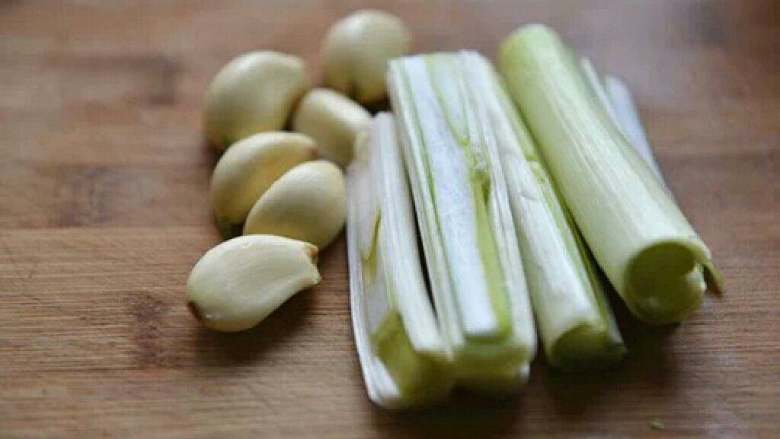 2. 剥几粒蒜,大葱一根切成段后,再切两半。