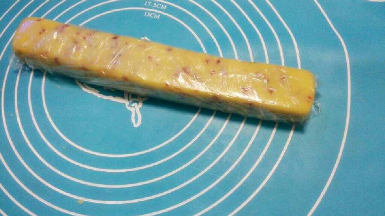 5. 揉成长条(如宽4cm*高6cm)或自己喜欢的形状如圆形等。 包上保鲜膜放入冰箱冷冻约一小时成型(方便切片)