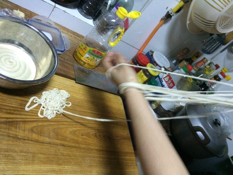 8. 如图大致跟细筷子粗细为准,一手捏住面条的一头,另一个手腕去接面,就像小时候给妈妈抻的毛线一样,将面条全部抻到两个手腕上