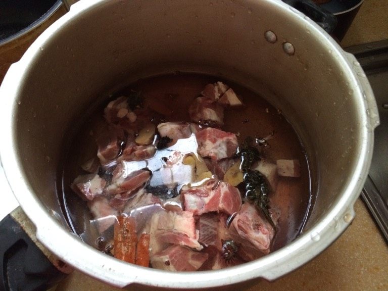 1. 羊肉切块洗净沥干,放入高压锅,加入紫苏、姜、胡椒粉、花椒,加水加醋刚漫过羊肉