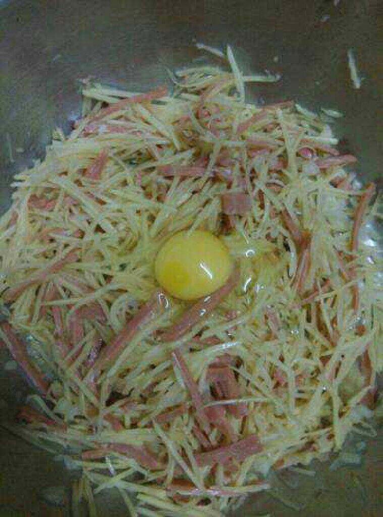 火腿土豆丝饼,加一个<a style='color:red;display:inline-block;' href='/shicai/ 9'>鸡蛋</a>.盐.胡椒粉.鸡精