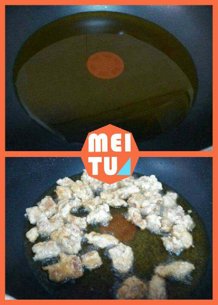 3. 锅放多一点油,放入腌好的肉丁炸金黄色