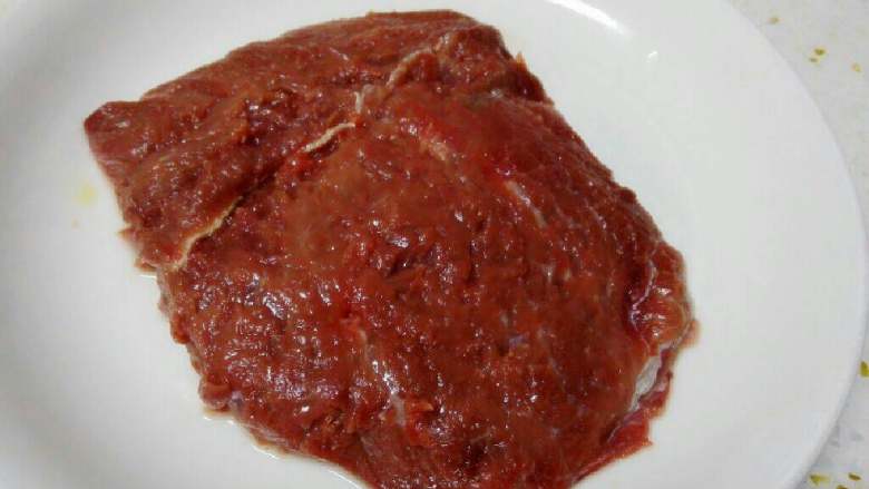 1. 牛里脊切成薄的大片(0.5厘米左右)。用刀背或者肉锤拍松牛肉。