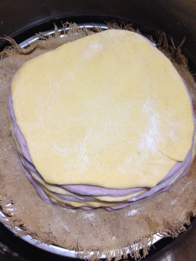 7. 如图分别把每个面块,擀成大小一样的面皮,厚度是3厘米