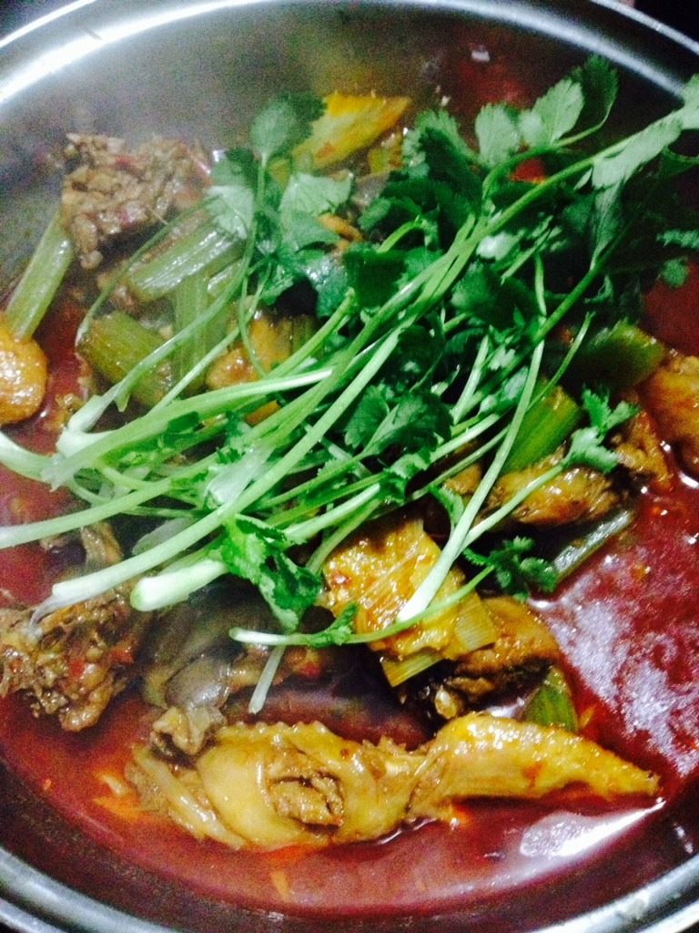 6. 倒入一听啤酒没过鸡块,不够可加些热水,下入之前准备好的尖椒,蒜块,葱段,红油!大火煮开,中火焖煮20分钟