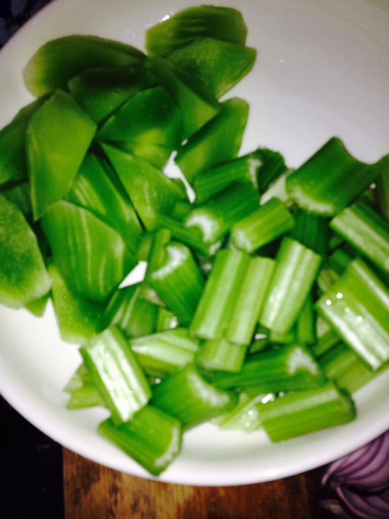 4. 油锅烧热下花椒红椒粒爆香,接着下青椒洋葱丝炒香