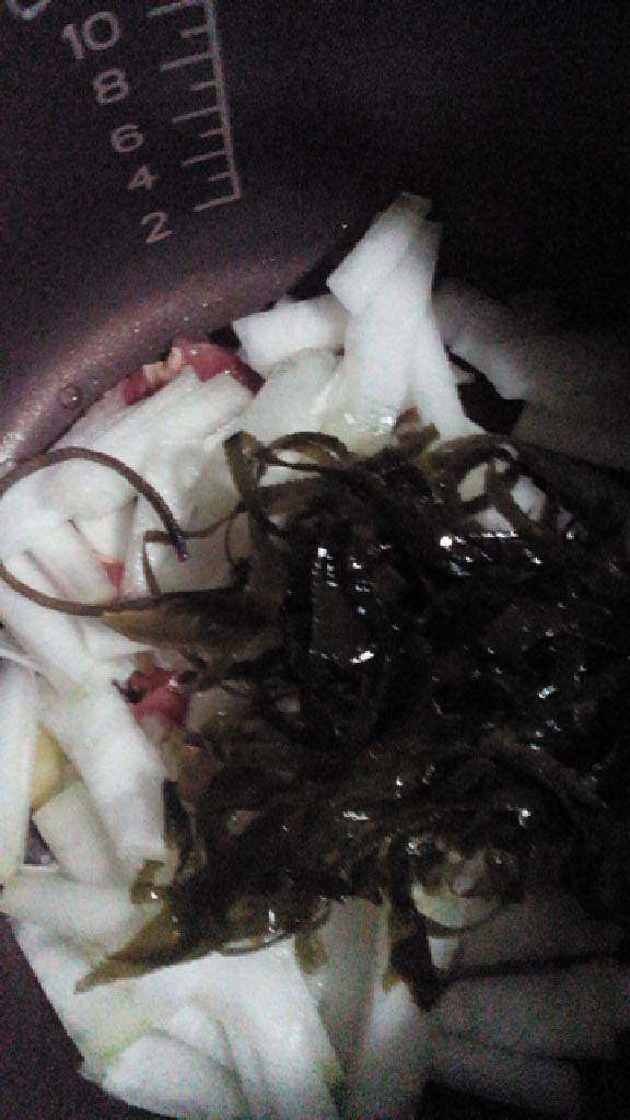 海带冬瓜肉片,葱姜切片铺锅底,滴少许油,