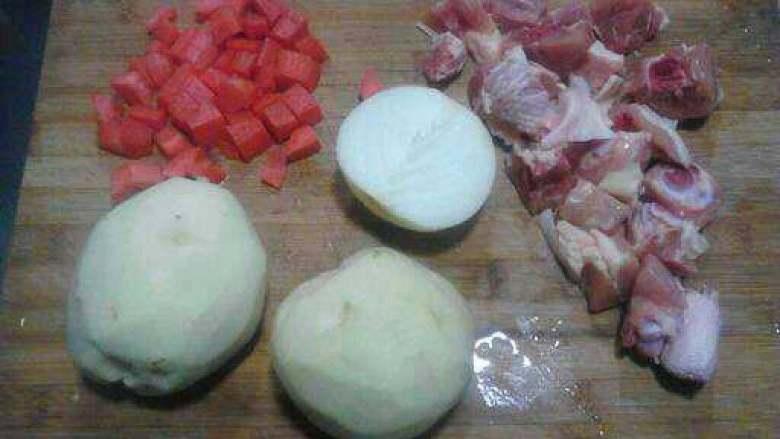 4. 鸡块变色后加入土豆,萝卜翻炒