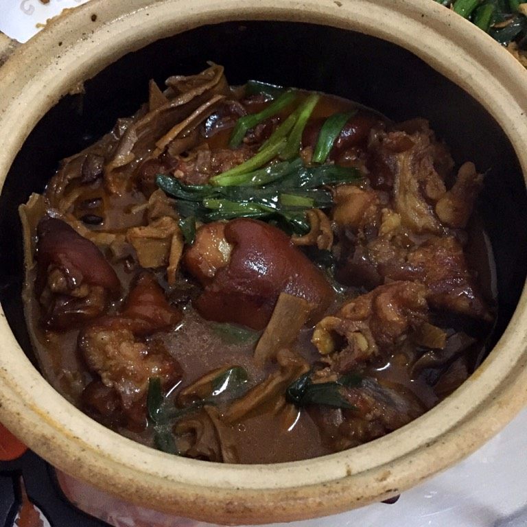11. 大火烧开后转小火慢炖一个半小时,猪脚酥烂后加入葱段