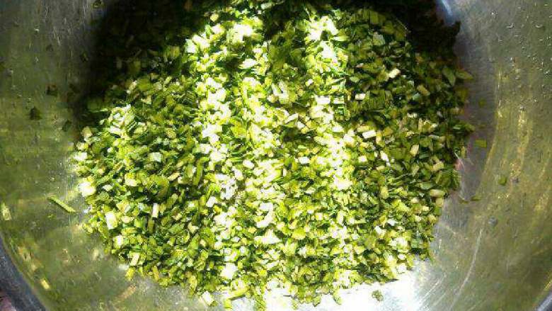 4. 韭菜和肉末放一起搅拌,加盐,鸡精,胡椒粉,酱油再搅拌