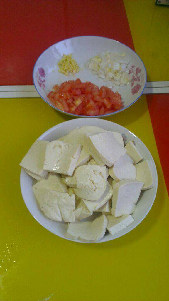 1. 将豆腐切厚片儿,西红柿洗净切块儿,葱和姜切碎备用;