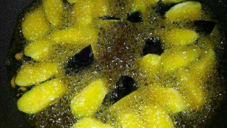 12. 待肉段和茄子都炸好后,再放入油锅中炸一遍.这样做的好处是外焦里嫩口感更好!