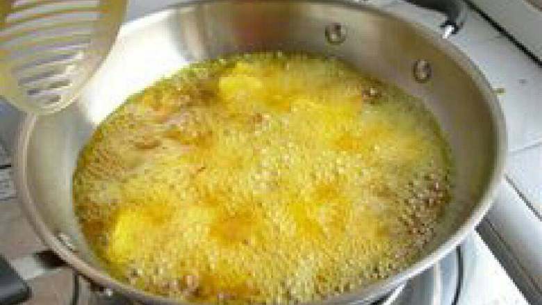4. 地瓜炸至外表变硬,颜色金黄捞出控油备用。