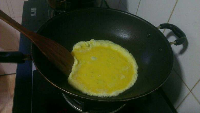 2. 炒锅放油烧热,倒打散的蛋液,用铲子划几刀炒散盛出待用;
