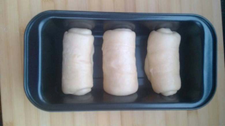 6. 将发好的面揉出气泡,分成三个大小相等的剂子,均搞成牛舌状长条,然后从一头卷起到另一头,均匀摆在土司模内