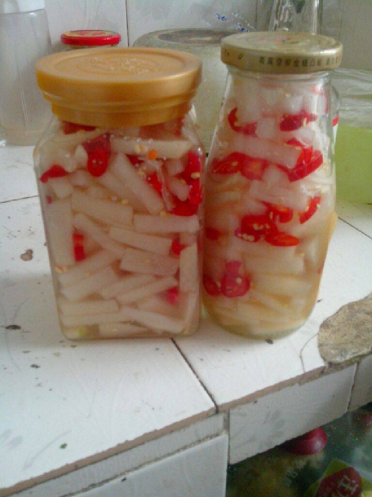 6. 装瓶倒入米醋,米醋的量是淹住萝卜的一半为止。放一天就可以吃啦