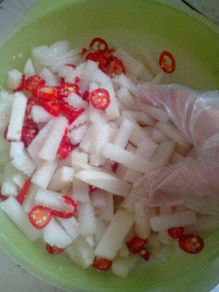 4. 控干水的萝卜加入辣椒跟糖(辣椒随个人喜欢加)