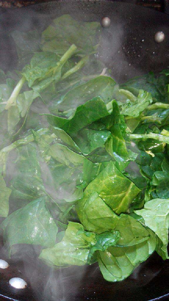 5. 待菠菜出水时入面筋泡,翻炒均匀加盐使其入味,淋入香油鸡精拌匀即可。