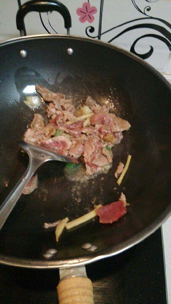 2. 锅中放油,油热加入葱姜煸香,再放入牛肉翻炒