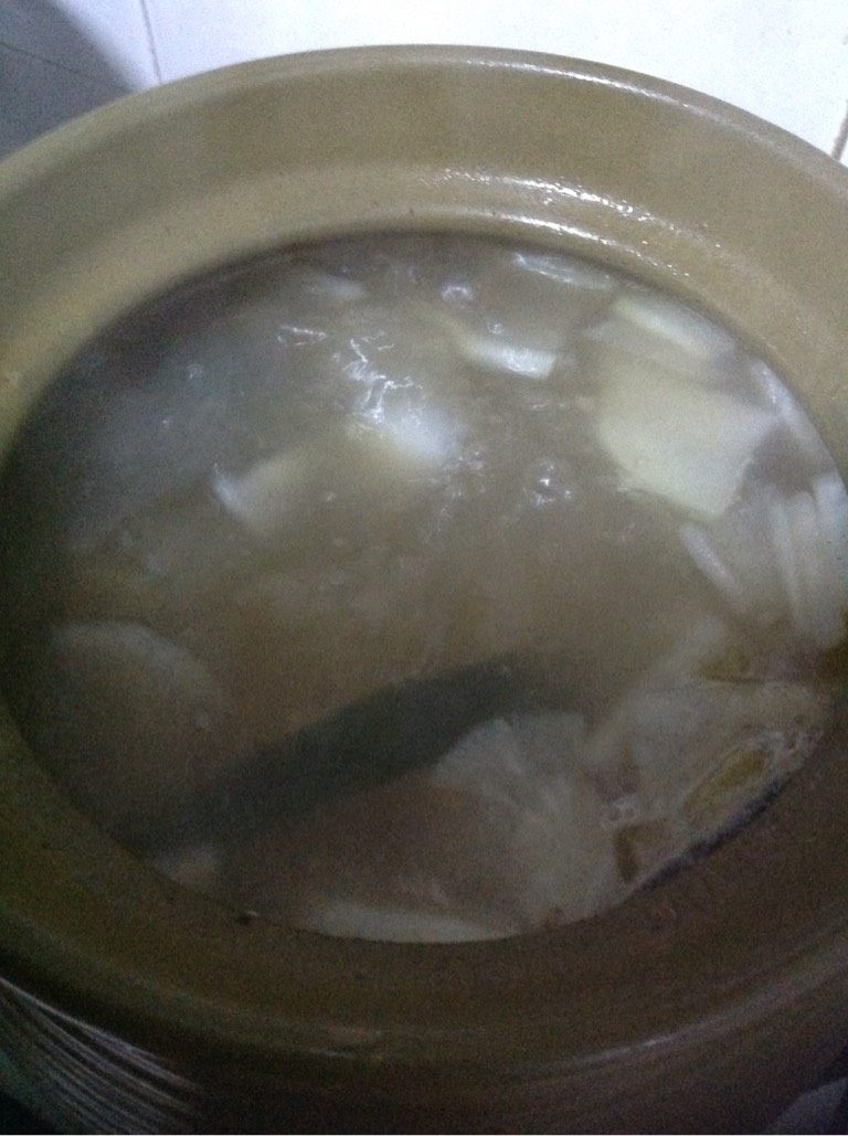 3. 骨头在砂锅里继续炖大概一个半小时左右,将萝卜洗净,切片,放入砂锅里,加适量盐,继续炖炖,将萝卜煮软即可关火,将调料包取出,沥干