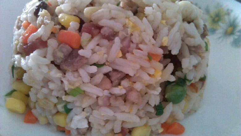 5. 十分钟左右后,水基本收干了,该熟的也熟了(可以试一下,如果还没熟,要再加水煮到东西熟了),这时候倒入2、3步材料翻炒均匀后再将米饭倒入(米饭最好是前天晚上煮好的)继续翻炒均匀后即可。