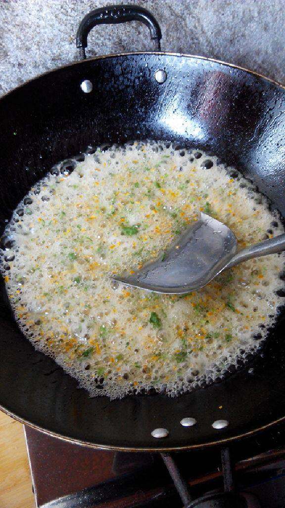 7. 炒至白糖完全化开冒小泡下香菜橘子粒
