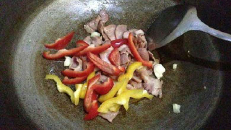 5. 加入黄红彩椒一起翻炒。